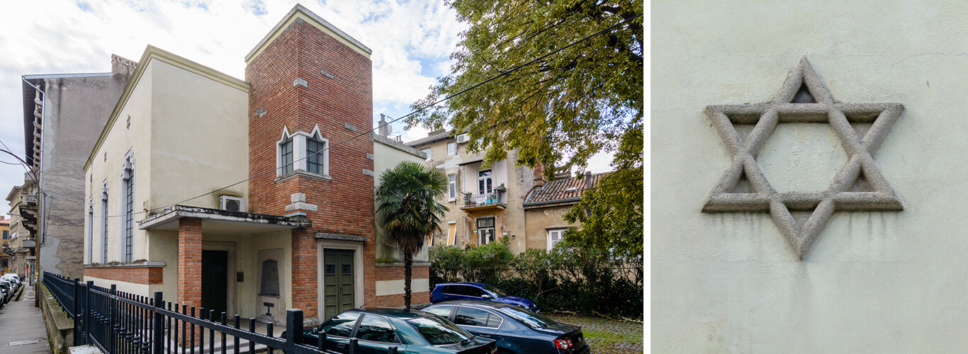 Riječka sinagoga izgrađena je 1930., autori su V. Angayal i P. Fabbo. Bez ukrasa je i simbola na pričelju, asimetričnog pročelja s oblogom od kamena i crvene cigle. Izgrađena je kao jednobrodna longitudalna građevina modernističkog duha, s elementima mediteranskog utjecaja i asocijacijama na art déco kao što su prozori sa stupnjevito-piramidalnim završecima i reljefnim motivom Davidove zvijezde iznad njih. Unutrašnjost hrama podijeljena je na obredni prostor s ...