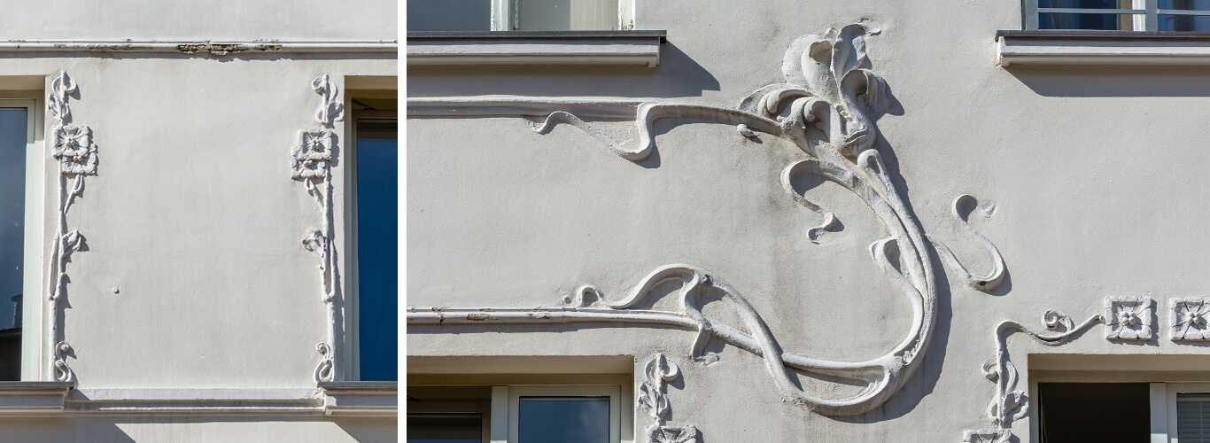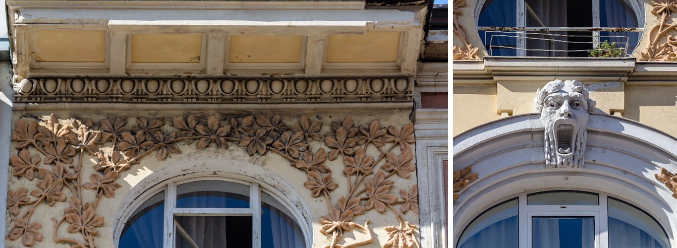 Ova zgrada odlikuje se izvrsnim dekoracijama u stilu art noveaua od vodoravnog friza s lisnatim motivima, reljefom perunika u centralnom dijelu do balkona i ograda izvedenih u kovanom željezu. Zavijutci, florealni motivi i ukrasni piloni ovoj zgradi daju eleganciju svojstvenu secesiji.